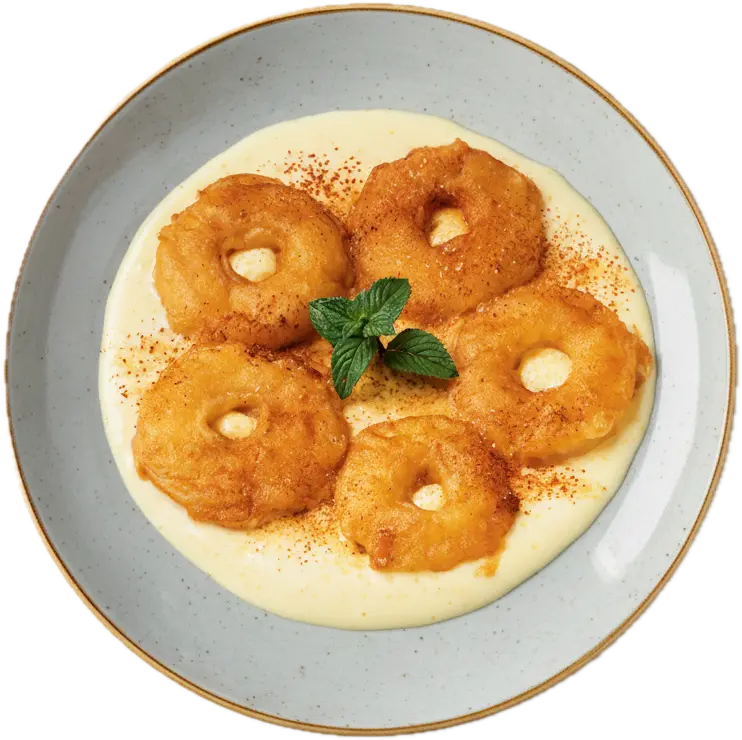 Goldgelb gebackene Apfelringe im Backteig, dazu unsere hausgemachte Quark-Vanillesoße, mit Zucker und Zimt.