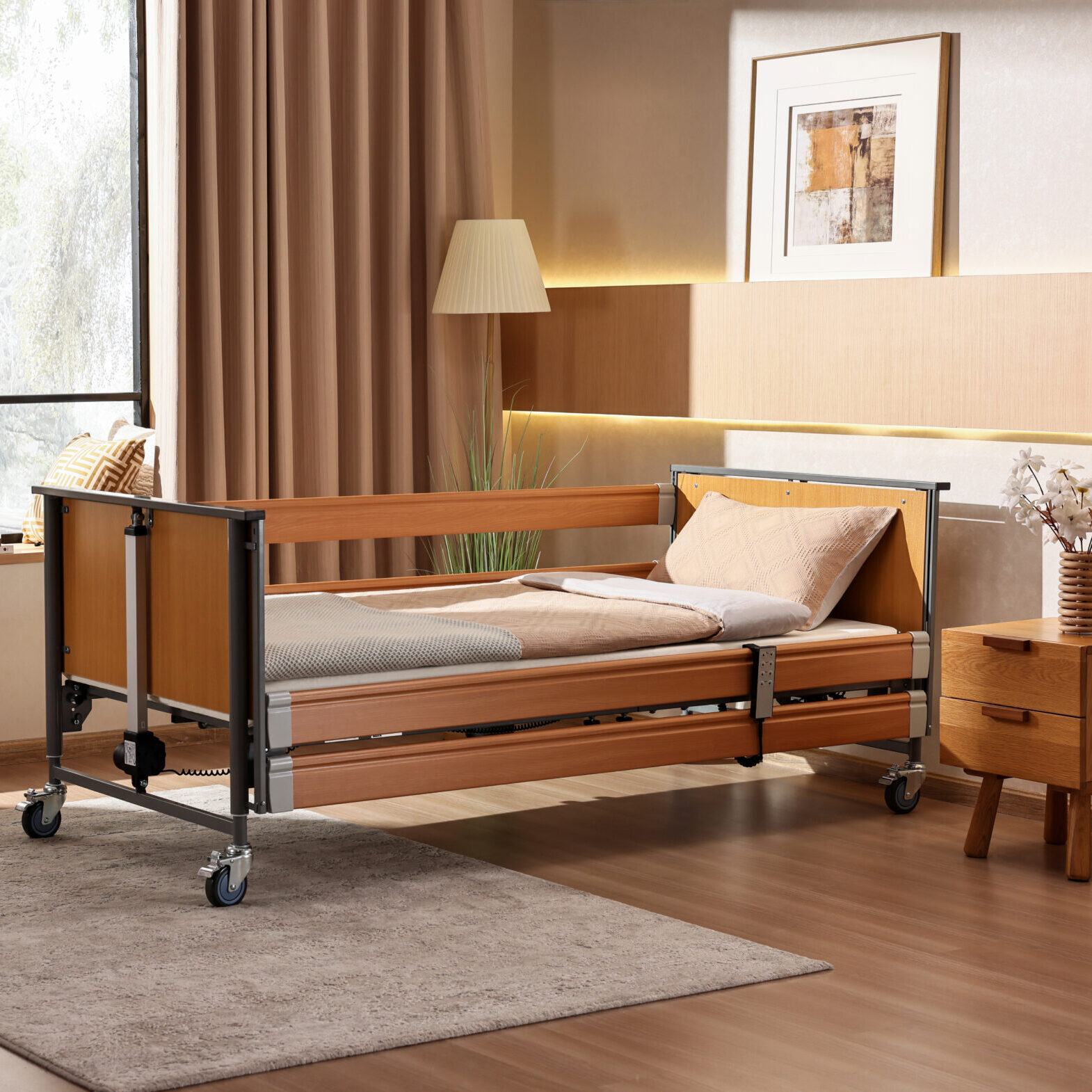 Das Ecofit S bietet völlig neuen Möglichkeiten, den Komfort und die Wohnlichkeit eines Pflegebettes zu steigern, da sie individuell angepasst werden können. Für diese Betten sind optional geteilte Seitensicherungen erhältlich, die für die häusliche Pflege sehr praktisch sind. Zur Abrundung des Designs gibt es Holzverkleidungen für die Endstücke, die dem Bett ein wohnlicheres Aussehen verleihen.