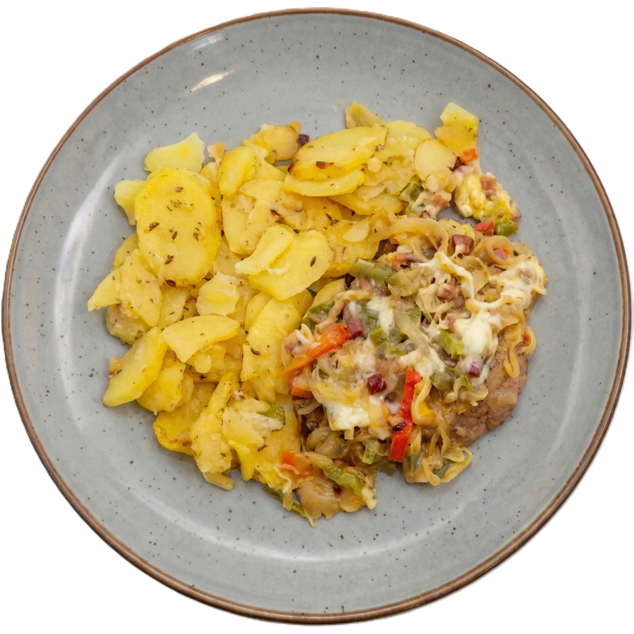 Schopfsteak mit Paprika, Speck, Zwiebeln und Käse überbacken, dazu Braterdäpfeln