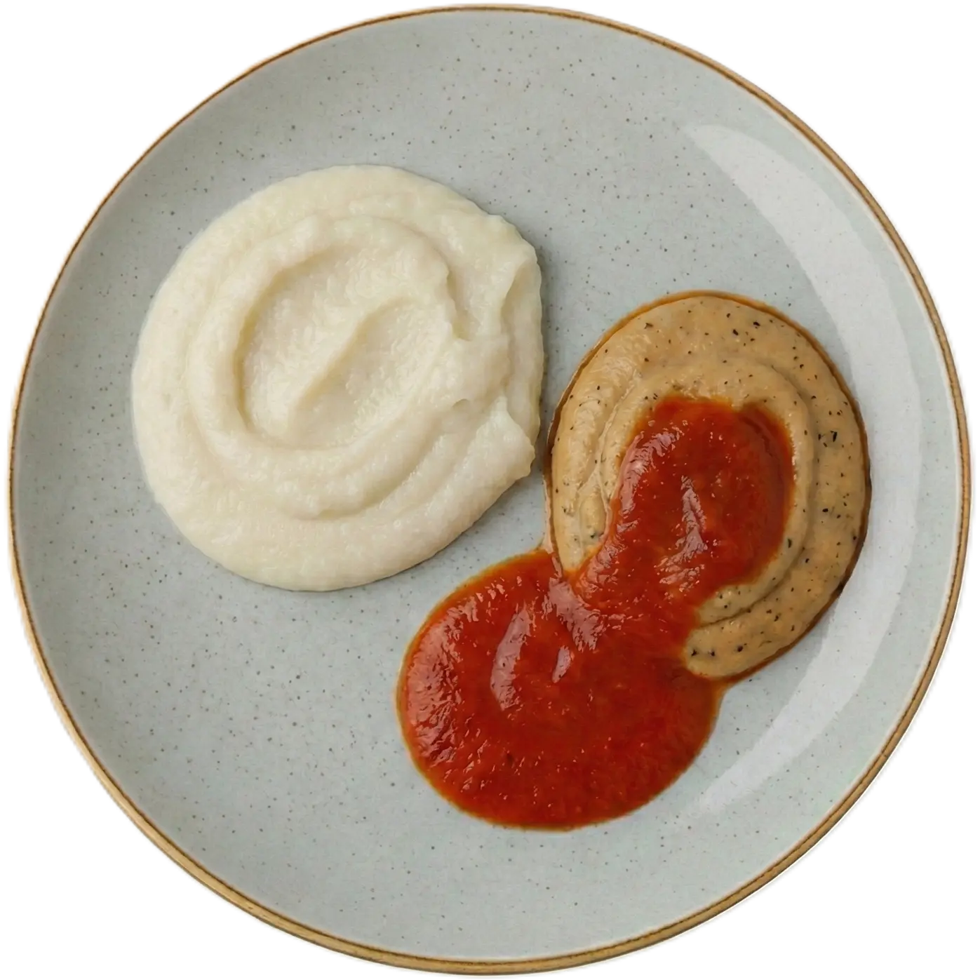 Huhn in fruchtiger Tomatensoße, mit Reisbrei aus Reisflocken