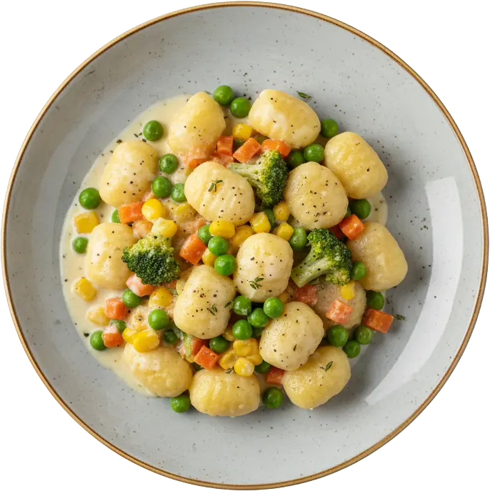 Gnocchi in cremiger Gemüsesauce aus Broccoli, Erbsen, Karotten und Mais