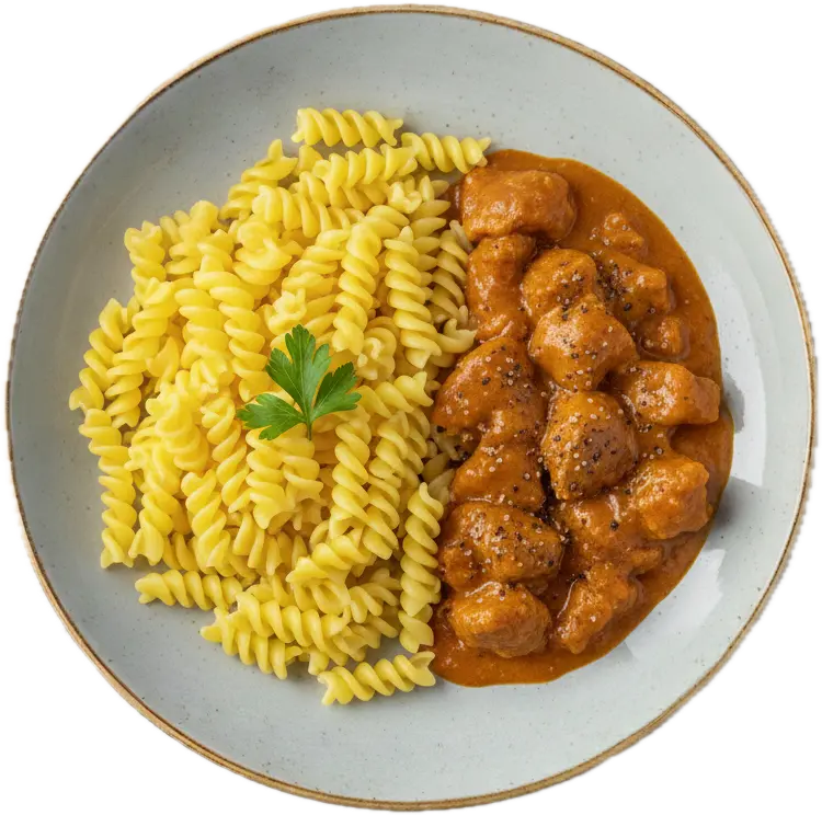 Jerelli-Nudeln gegart (Wasser, HARTWEIZENGRIEß), Schweinsgeschnetzeltes gegart (19%), Wasser, SCHLAGOBERS, Champignons (7%), Zwiebel, Speck geräuchert (2%) (Schweinefleisch, Wasser, Speisesalz, Gewürze, Stabilisator Polyphosphate, Glucose, Antioxidationsmittel Natrium-L-Ascorbat, Nitritpökelsalz (Speisesalz, Konservierungsmittel Natriumnitrit), Rauch), Rapsöl, jodiertes Speisesalz (Speisesalz, Kaliumjodid), Maltodextrin, Erdäpfelstärke, Aroma, Zucker, Zwiebelpulver, Rindfleischextrakt, modifizierte Maisstärke, Paradeisermark, Paprikapulver, Knoblauch, Majoran, Kümmel, Pfeffer weiß.