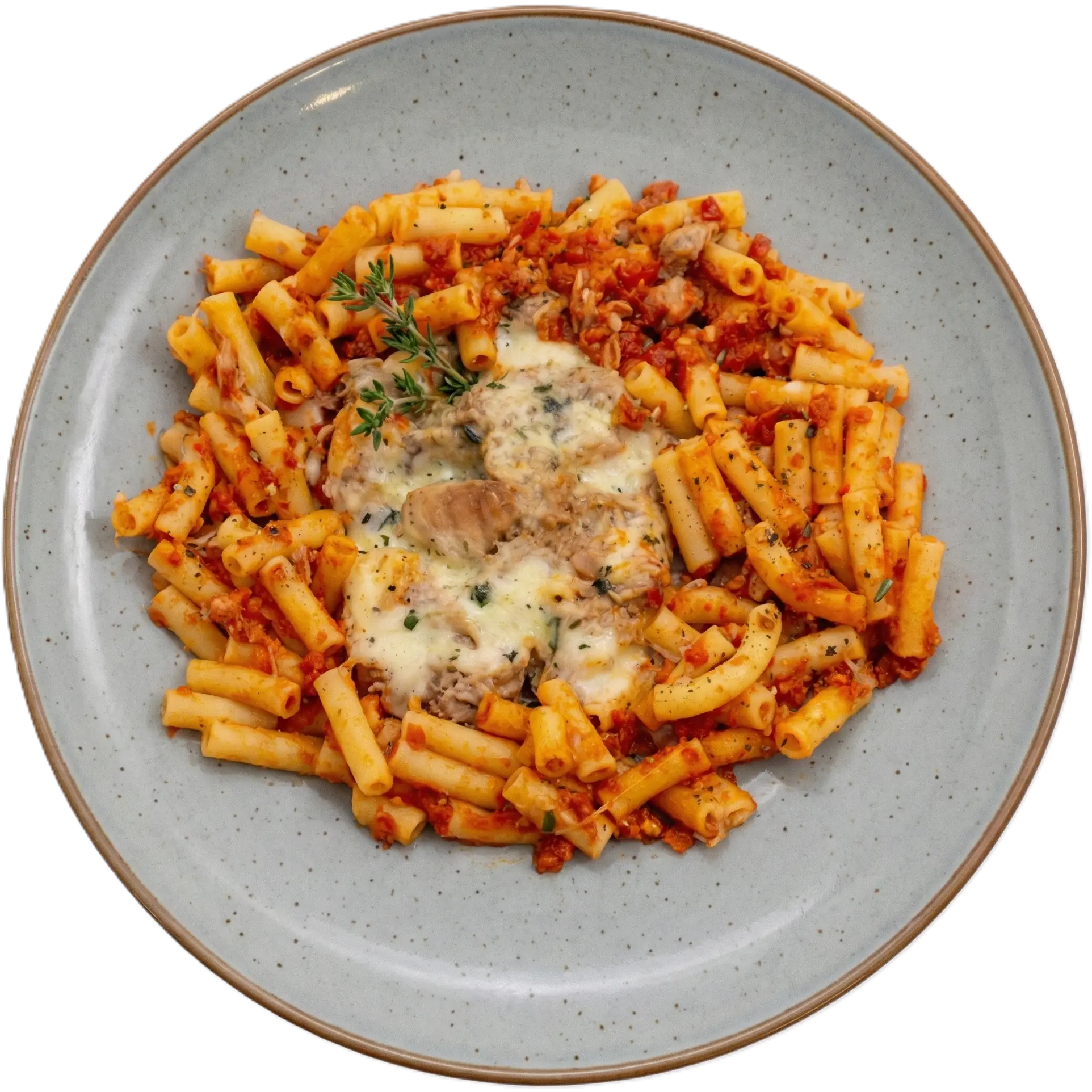 Maccaroni gegart (Wasser, HARTWEIZENGRIEß, HÜHNEREI), Paradeiser, Paradeisersaft, THUNFISCH (14%) Sonnenblumenöl, Mozzarella (9%) (KUHMILCH, Maisstärke, Speisesalz, Starterkultur, mikrobielles Lab), Olivenöl, HARTKÄSE (enthält EI, mikrobielles Lab), jodiertes Speisesalz (Speisesalz, Kaliumjodid), Sonnenblumenöl, Knoblauch, Pinienkerne, Basilikum.