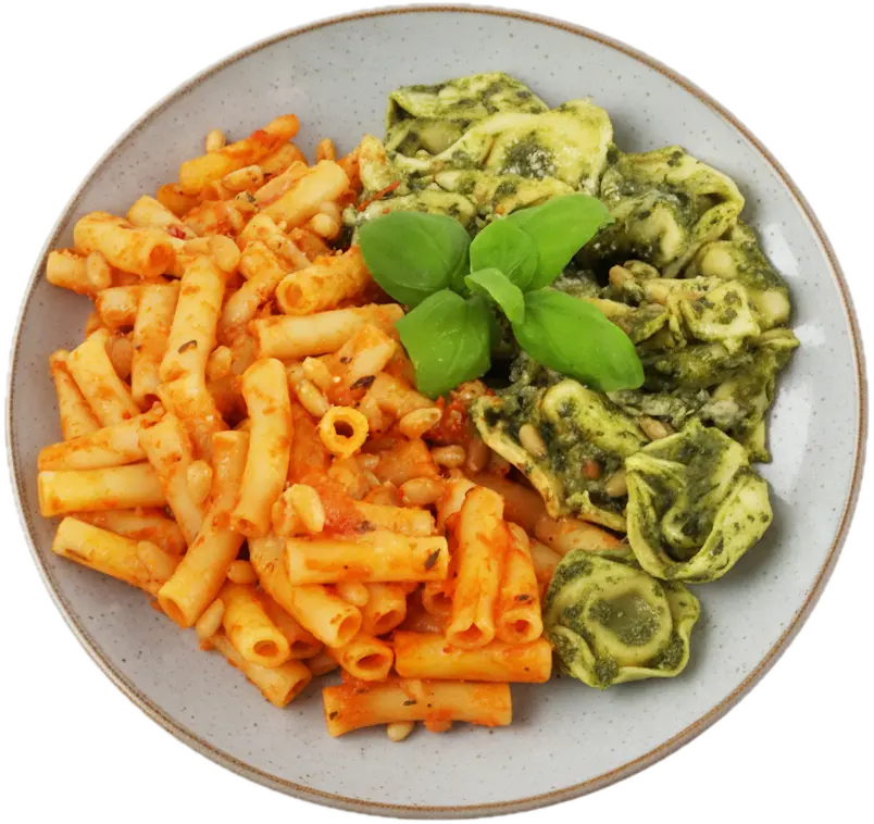 Tortellini gegart (HARTWEIZENGRIEß, Wasser RICOTTA (8%) (mikrobielles Lab), WEIZENMEHL, Spinat (6%), HÜHNERVOLLEI (3,5%), KÄSE (mikrobielles Lab), Speisesalz, Gewürze, Hefe), Maccaroni gegart (Wasser, HARTWEIZENGRIEß, HÜHNEREI), Wasser, Paradeiser, Paradeisersaft, SCHLAGOBERS (8%), Spinat, HARTKÄSE (2%) (enthält EI, mikrobielles Lab), Basilikum (1%), Zwiebeln, Pinienkerne (1%), jodiertes Speisesalz (Speisesalz, Kaliumjodid), Rapsöl, Zucker, Olivenöl, SAUERRAHM, Paradeisermark, modifizierte Maisstärke, Paprika, Thymian, Knoblauch, Zitronenschalen geraspelt, Gewürzextrakt, Säuerungsmittel Citronensäure, Chili, Pfeffer weiß, Muskat, Oregano.